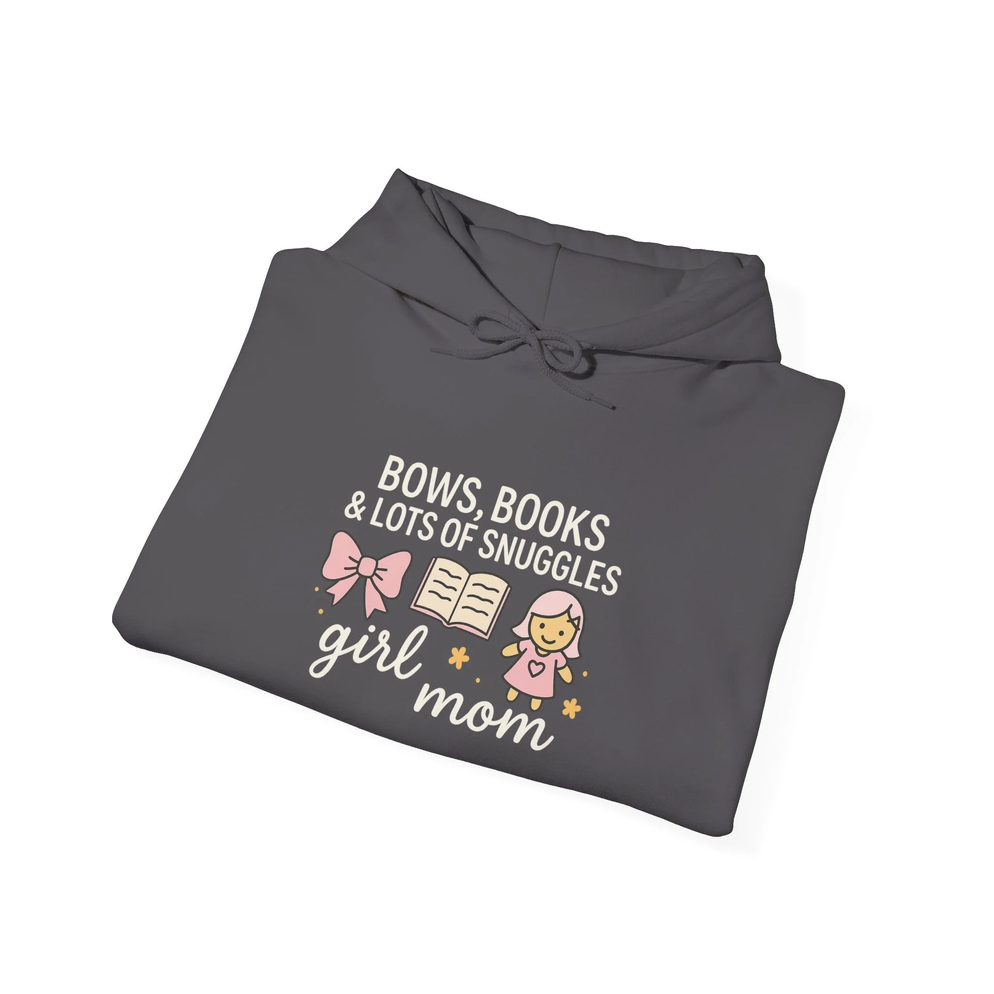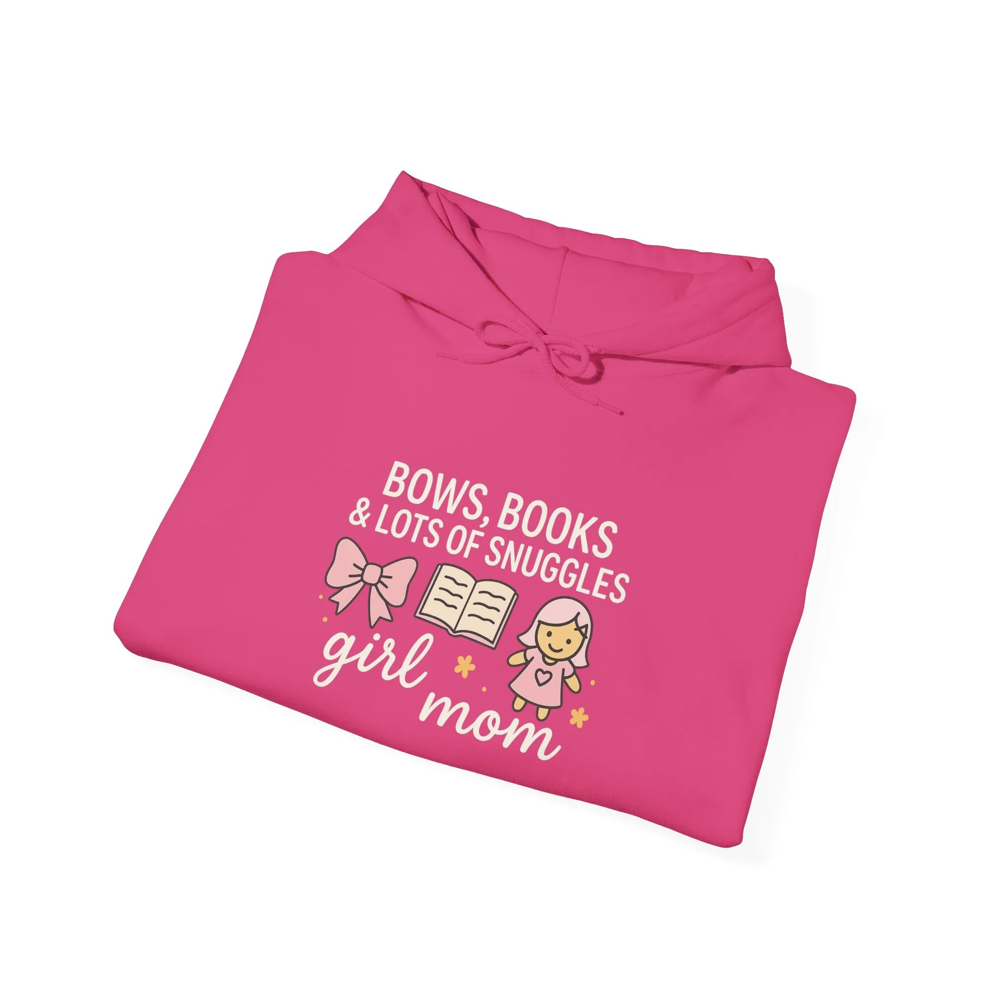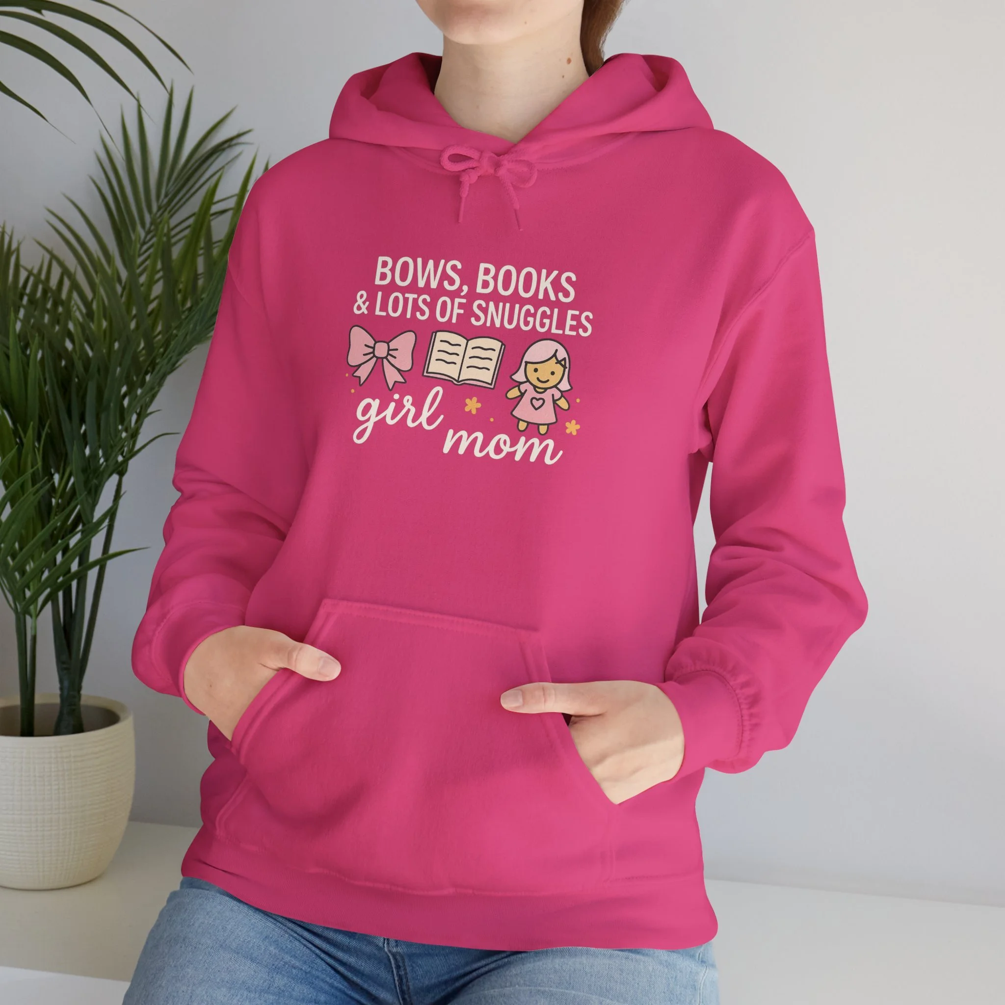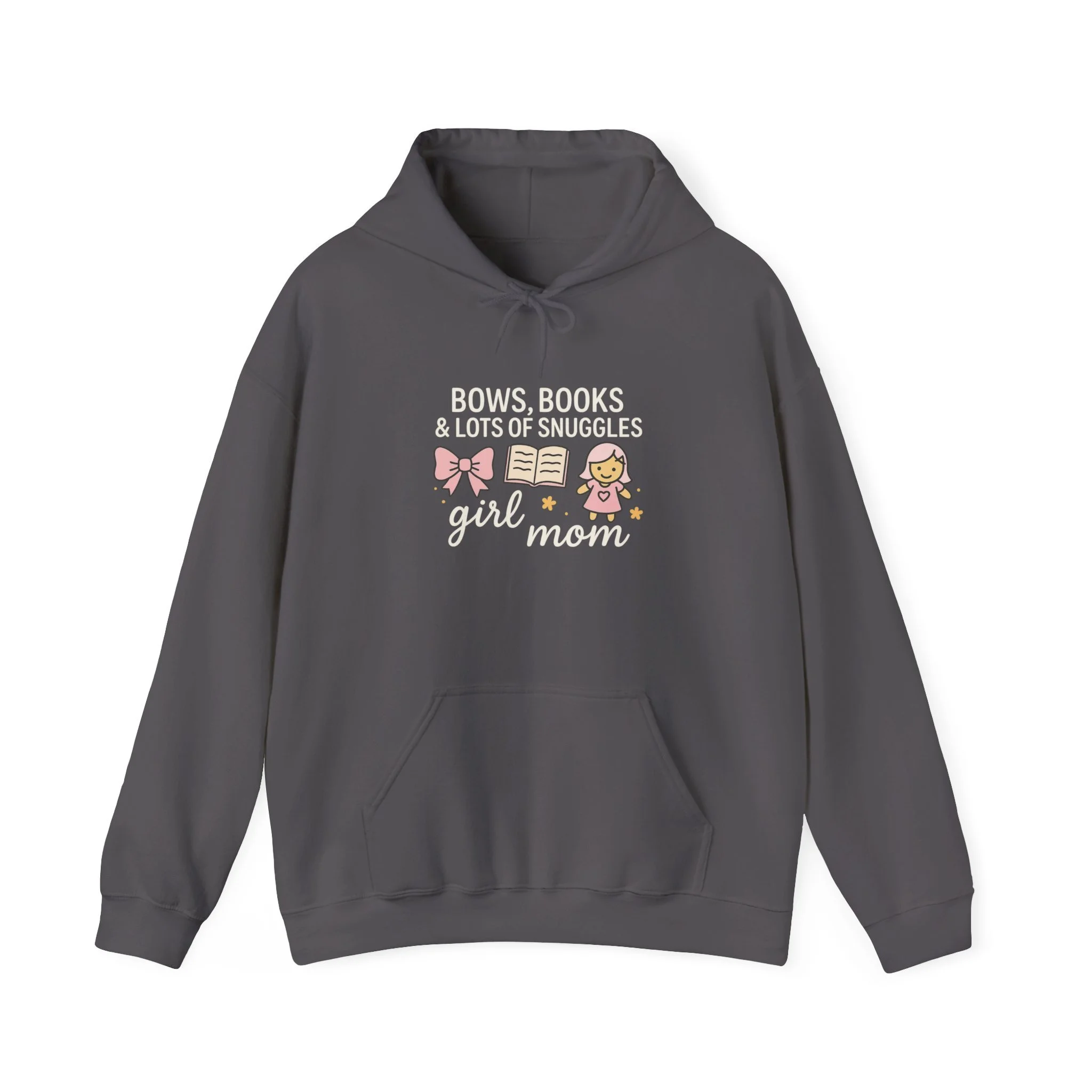 A cozy, lived‑in hoodie that wraps around all the sweetness and sparkle of raising girls. Its soft, medium‑weight fleece holds a playful, hand‑drawn design—bows, books, and a cheerful little doll—framed by the phrase “Bows, Books & Lots of Snuggles” and a warm “girl mom” script. It slips on for morning cuddles, stays soft through school drop‑offs, story times, and dance‑class afternoons, and washes clean after crafts, crumbs, or glitter‑covered moments. The roomy kangaroo pocket and double‑lined hood add everyday practicality, while the neutral white lets the pastel artwork shine and pair effortlessly with any casual outfit. This hoodie feels like a soft nod to sleepy hugs, giggly chaos, and all the tiny, magical moments in between.