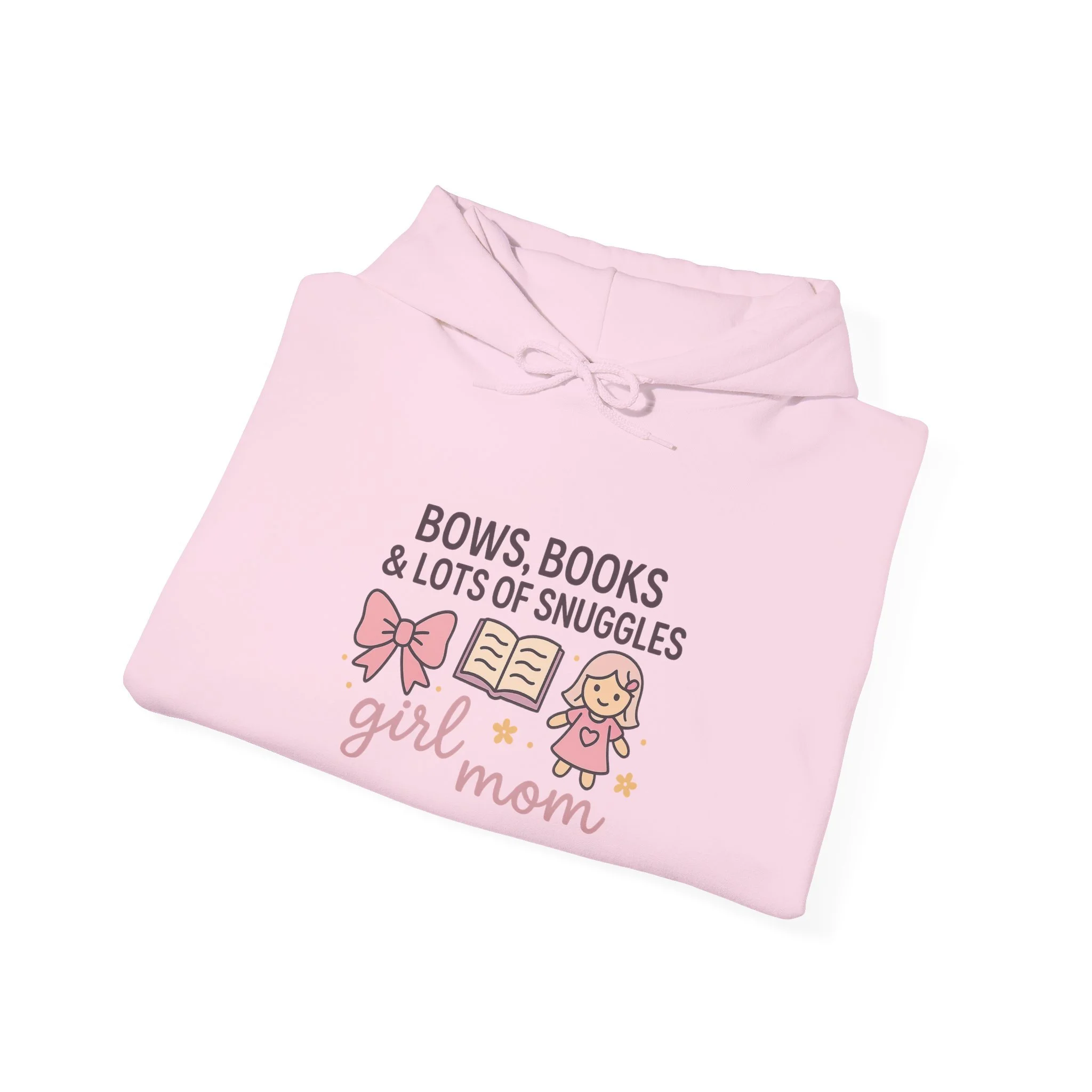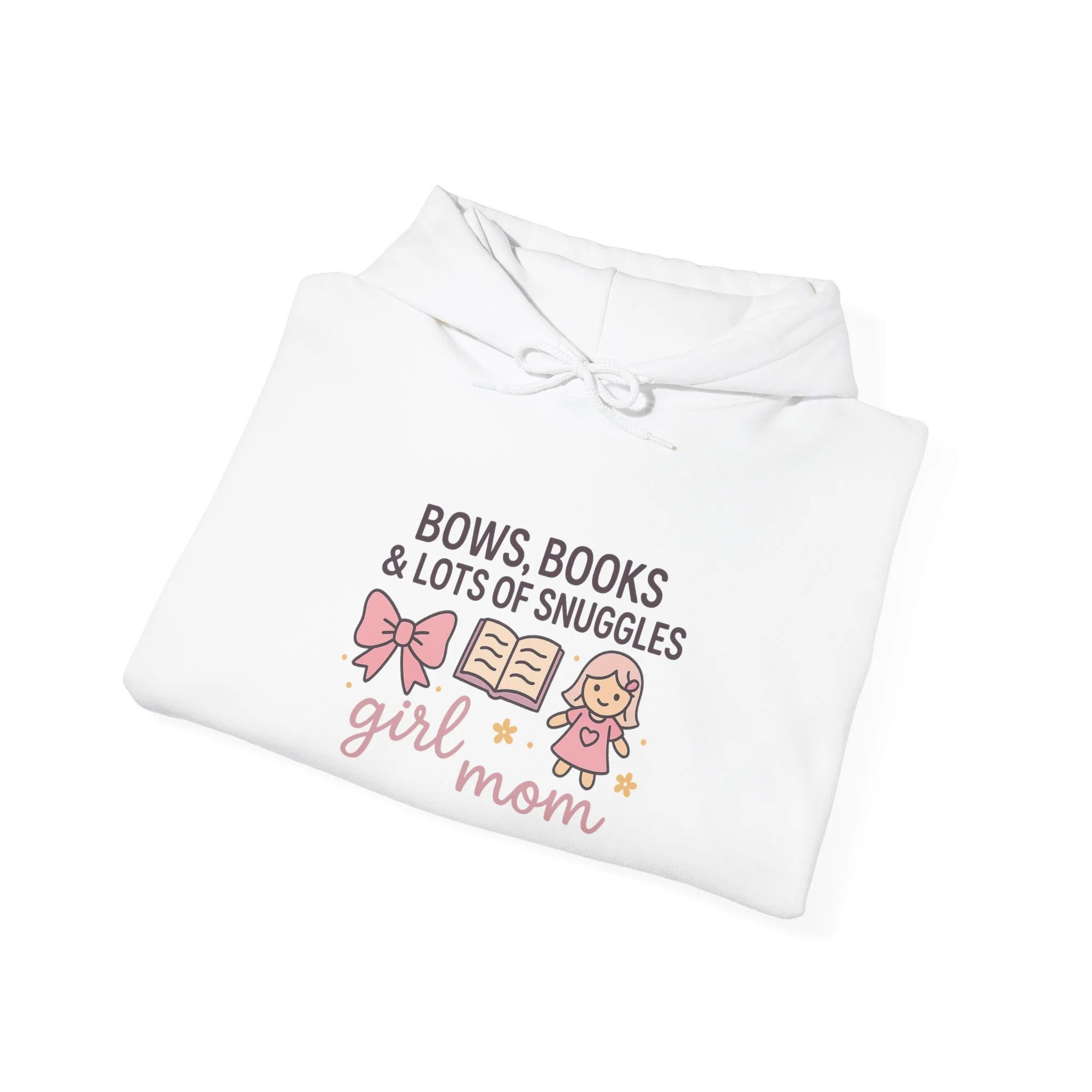 A cozy, lived‑in hoodie that wraps around all the sweetness and sparkle of raising girls. Its soft, medium‑weight fleece holds a playful, hand‑drawn design—bows, books, and a cheerful little doll—framed by the phrase “Bows, Books & Lots of Snuggles” and a warm “girl mom” script. It slips on for morning cuddles, stays soft through school drop‑offs, story times, and dance‑class afternoons, and washes clean after crafts, crumbs, or glitter‑covered moments. The roomy kangaroo pocket and double‑lined hood add everyday practicality, while the neutral white lets the pastel artwork shine and pair effortlessly with any casual outfit. This hoodie feels like a soft nod to sleepy hugs, giggly chaos, and all the tiny, magical moments in between.