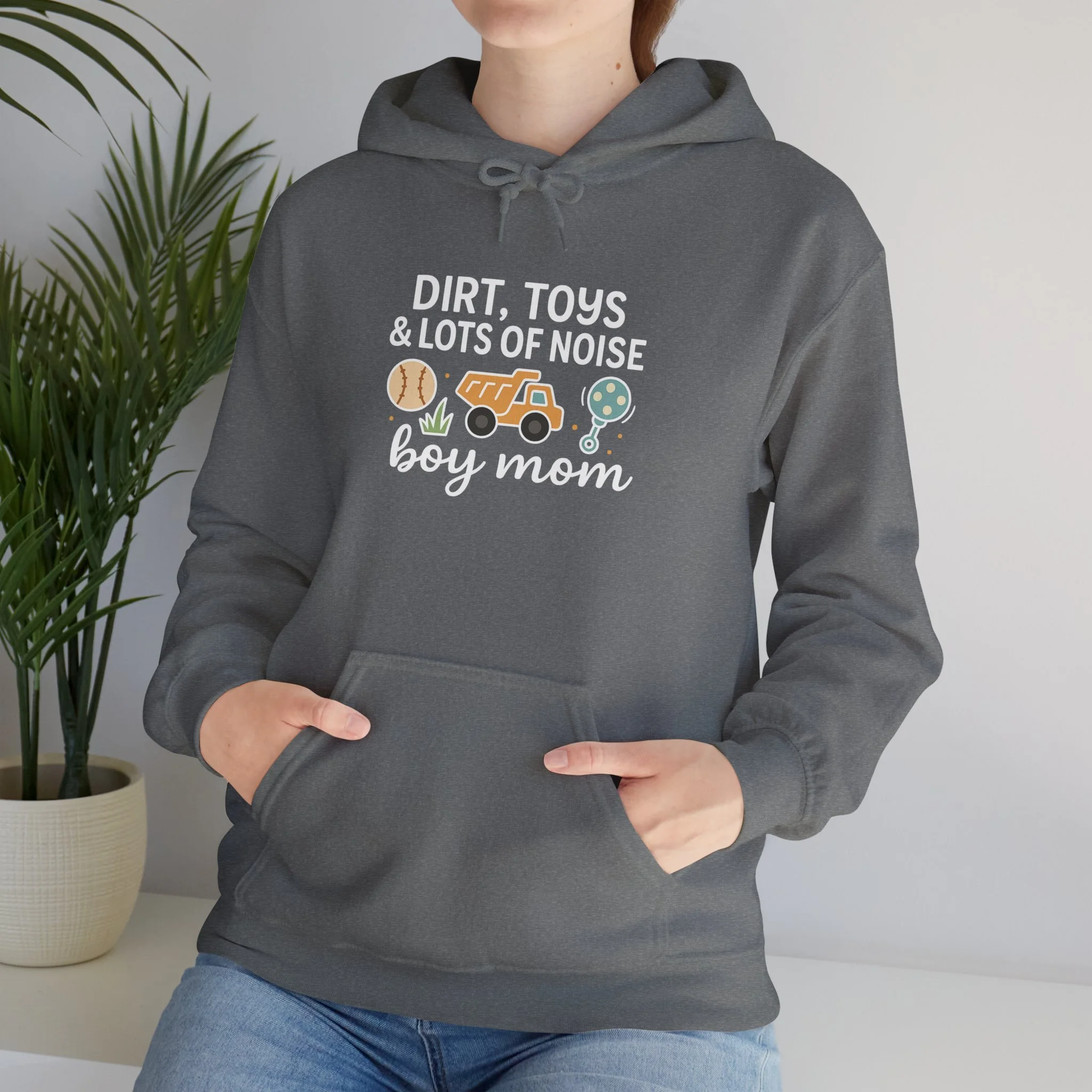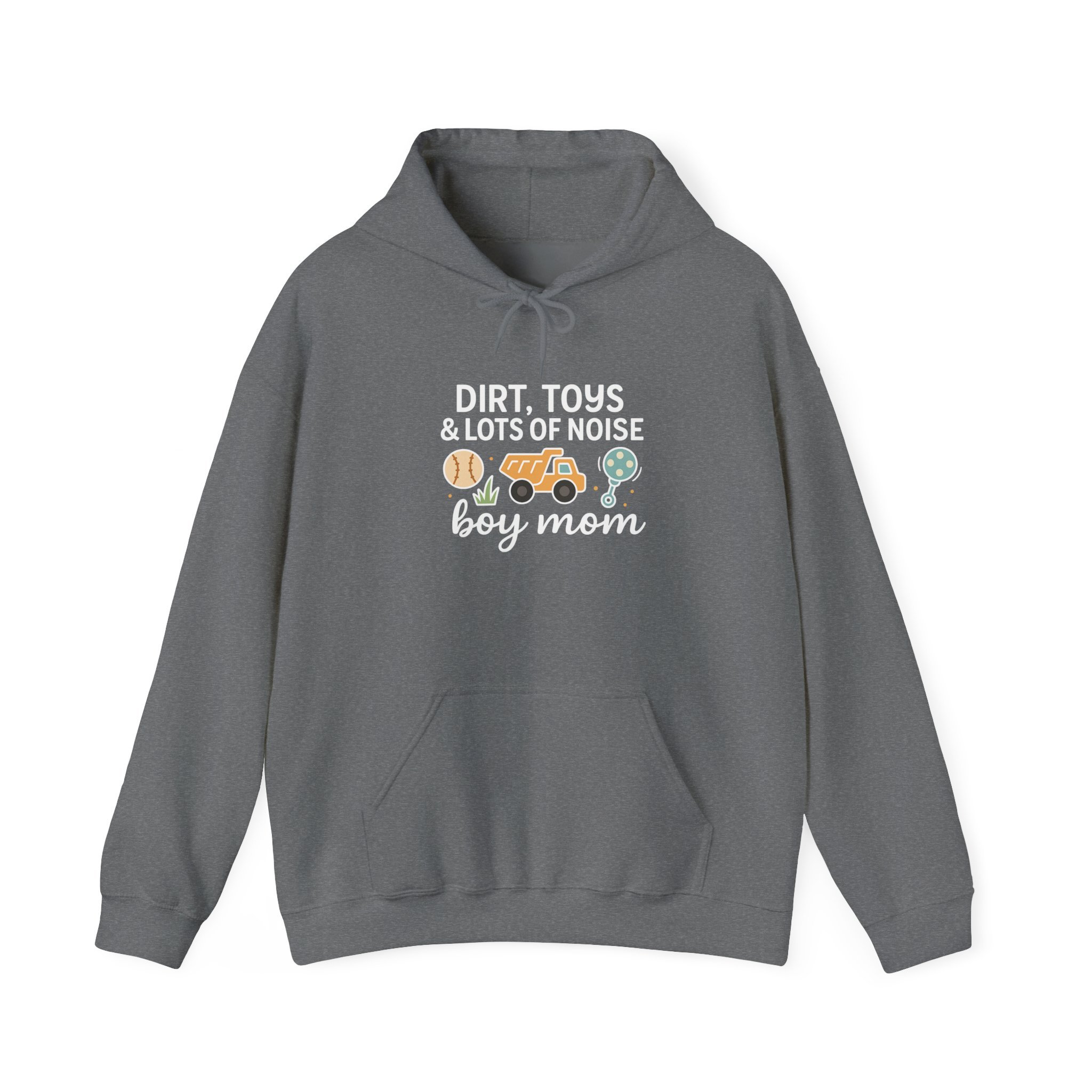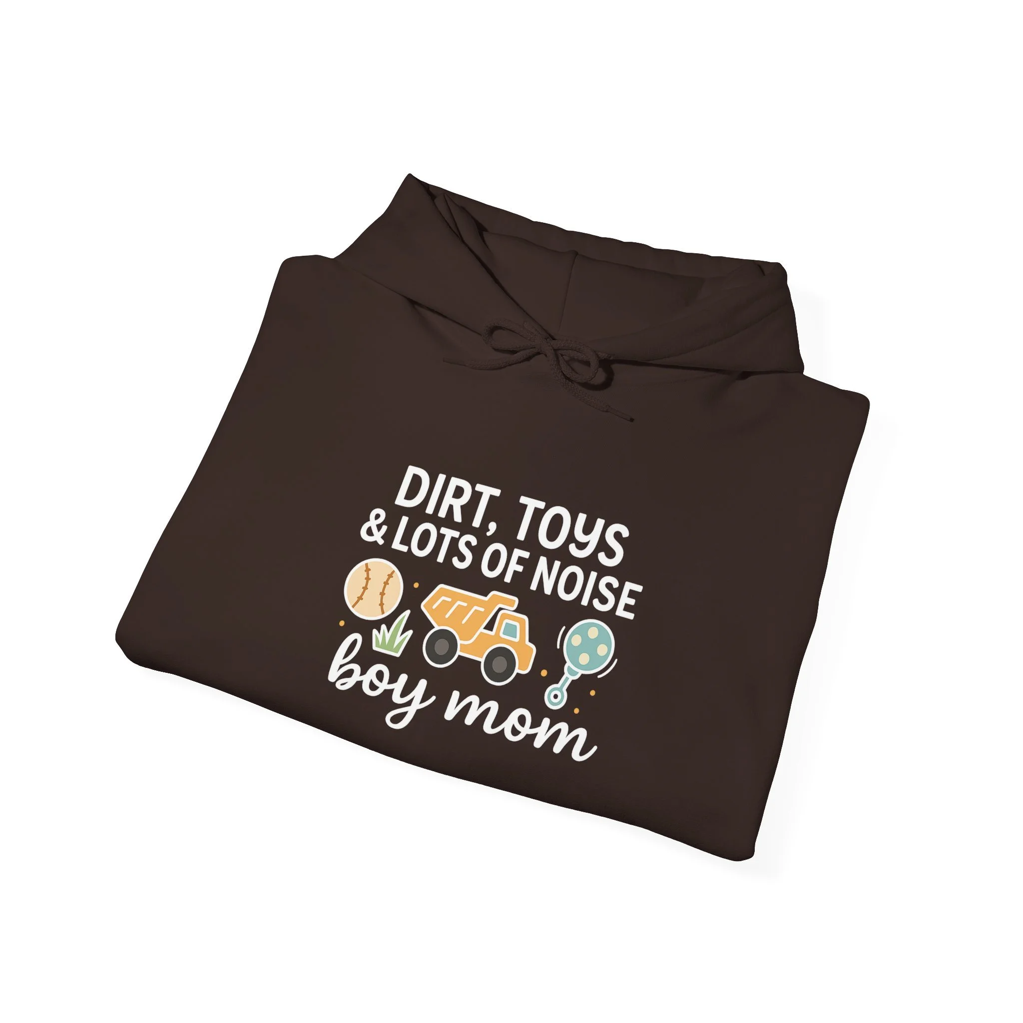 A cozy, lived-in hoodie that celebrates the joyful chaos of raising boys. Soft, medium-weight fleece holds a playful, hand-drawn design—baseball, toy truck, and helmet—framed by the phrase “Dirt, Toys & Lots of Noise” and a warm “boy mom” script. It slips on after a muddy weekend of backyard adventures, stays comfortable through school runs and soccer practices, and washes up ready for the next scrape or stain. The roomy kangaroo pocket and double-lined hood add practical comfort; the neutral white lets the colorful print pop while matching any everyday outfit. This hoodie feels like a quiet nod to tired but proud evenings, noisy mornings, and all the small, sticky moments in between.